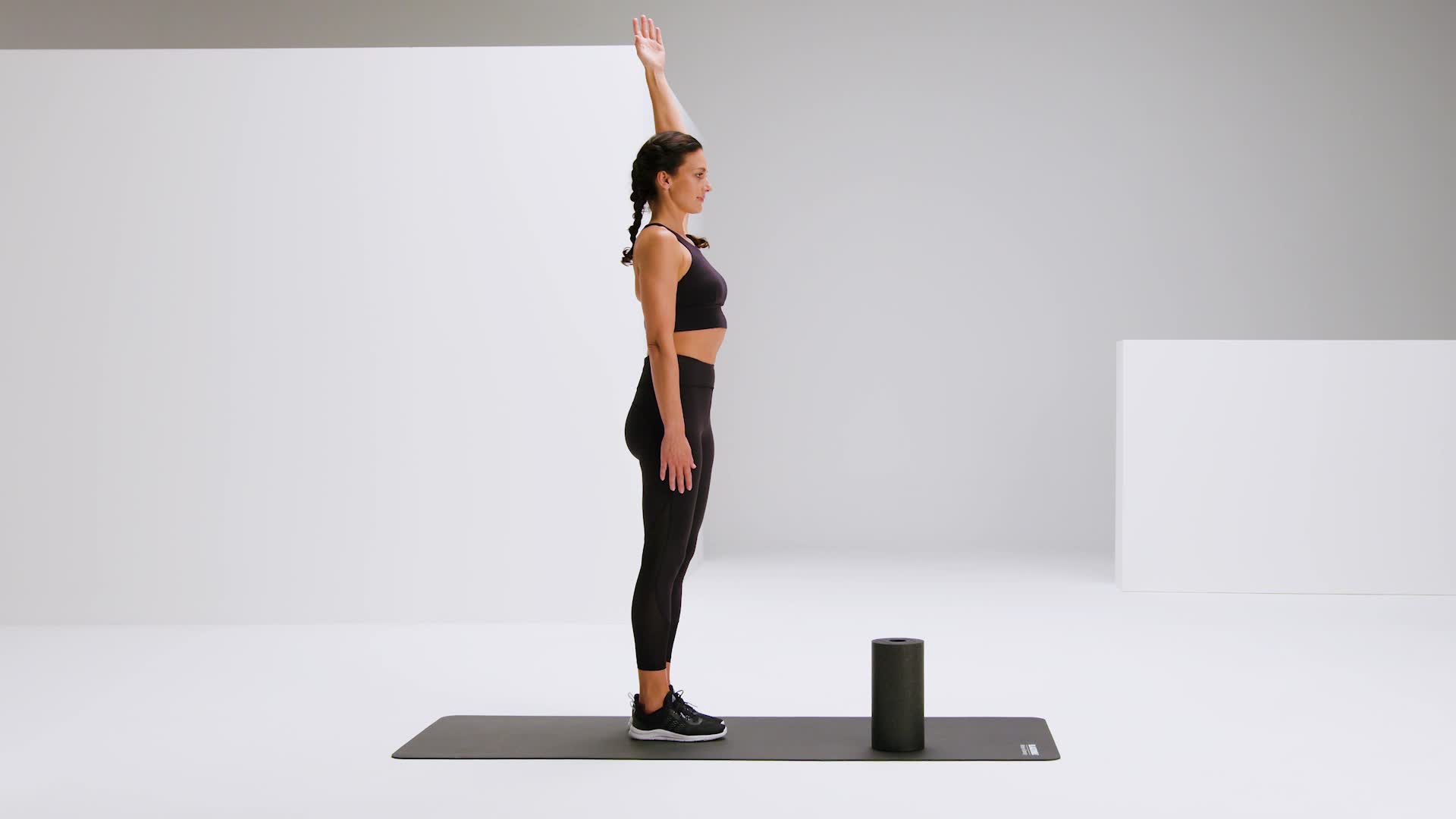 Hold a BLACKROLL® in your hands and apply light pressure against it. Roll your shoulder blades back, down, and then hold. Then bring your arms toward the ceiling. Pay attention to your upright posture and maintain it.